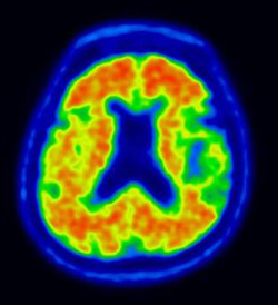 | ▲ 알츠하이머병의 가능성이 높다는 것을 의미하는 영상이다. 붉을수록 베타아밀로이드 밀도가 높다. |